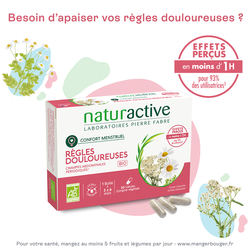 Naturactive Règles Douloureuses BIOJudicieuse association de deux extraits concentrés de plantes BIO : un extrait de Grande Camomille et un extrait d’Achillée millefeuille, apaisant les crampes abdominales et favorisant le confort menstruel, avec des effets perçus en moins d’une heure pour 93% des utilisatrices. Conseil d’utilisation : 1 à 3 gélules par jour selon l’intensité de l’inconfort. 3 gélules peuvent être prises en même temps si nécessaire. Effets perçus en moins d’une heure pour 93% des utilisatrices (étude en conditions d’usage - 91 personnes - 1 à 3 gélules par jour). Complément alimentaire. Boîte de 10 ou 30 gélules. En pharmacie. |