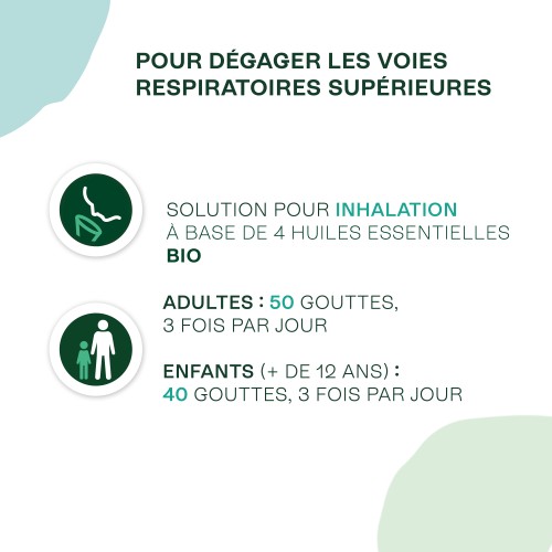 Cette formule contient 4 huiles essentielles Bio dont la Menthe poivrée et le Romarin officinal à 1,8-cinéole qui contribuent à dégager les voies respiratoires supérieures.
