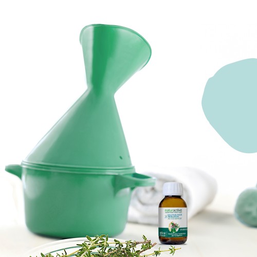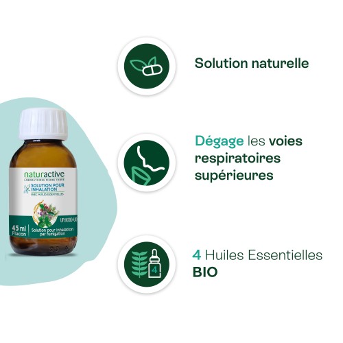 La SOLUTION POUR INHALATION Naturactive contient 4 huiles essentielles Bio dont la Menthe poivrée et le Romarin officinal à 1,8-cinéole qui contribuent à dégager les voies respiratoires supérieures, associées à la Lavande fine et au Giroflier.