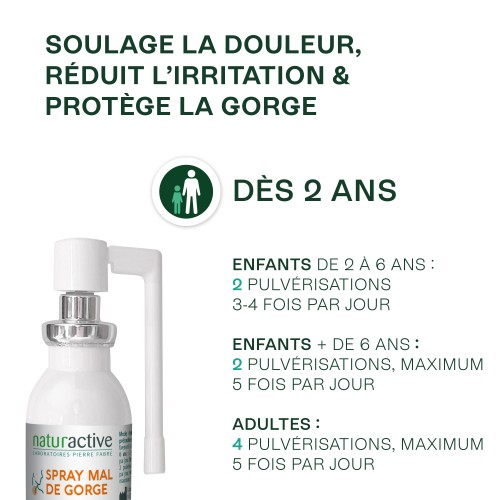. Entre 2 et 3 ans, le Spray Mal de gorge peut être administré mais il est recommandé de demander l'avis de votre médecin avant utilisation : pour un enfant de 2 à 3 ans, le mode d'emploi serait 2 pulvérisations 3-4 fois par jour.