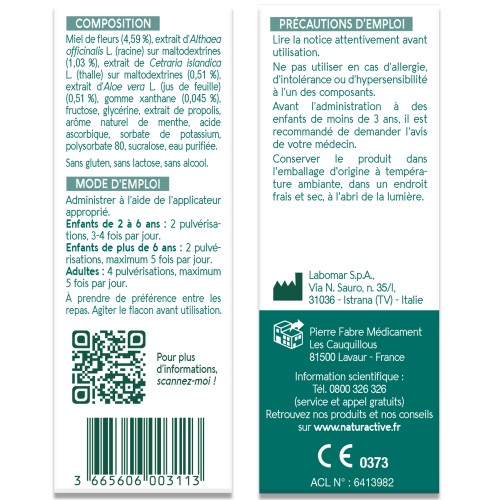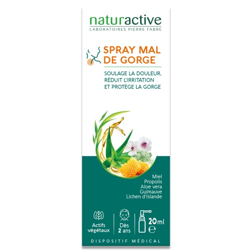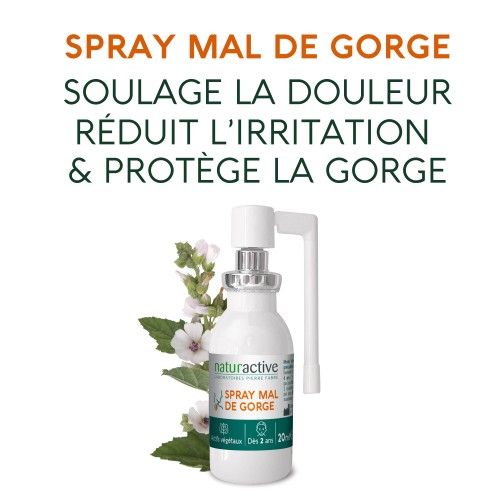 Le Spray MAL DE GORGE Naturactive protège des irritations et apaise la gorge. Sa formule contient du miel de fleurs, de la propolis et des extraits concentrés de plantes (Aloe vera, Guimauve, Lichen d'Islande).