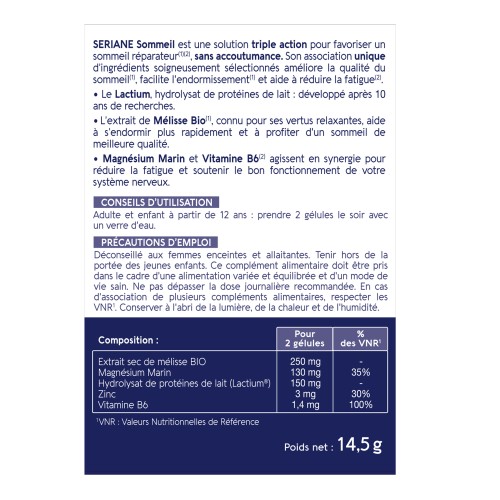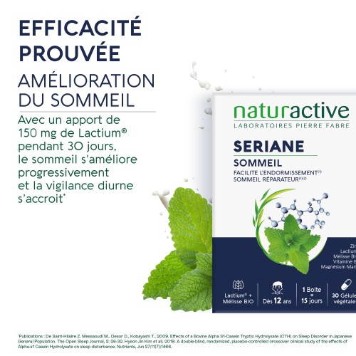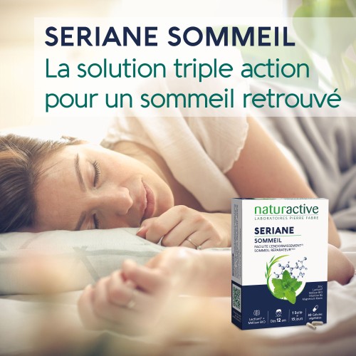 • En cas de troubles du sommeil lié au stress, SERIANE SOMMEIL peut être associé à la formule Naturactive Anxiété, à utiliser dans la journée pour limiter le stress.